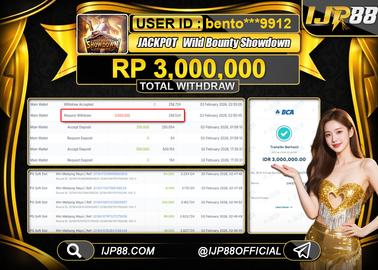 Bukti kemenangan Wild Bounty Showdown ini menunjukkan penarikan dana Rp3.000.000 yang berhasil diproses tanpa kendala. Detail transaksi tercatat rapi dari aktivitas permainan hingga dana masuk ke rekening. Proses cepat dan jelas ini mencerminkan layanan IJP88 yang konsisten, aman, dan memberikan kenyamanan bagi para member.